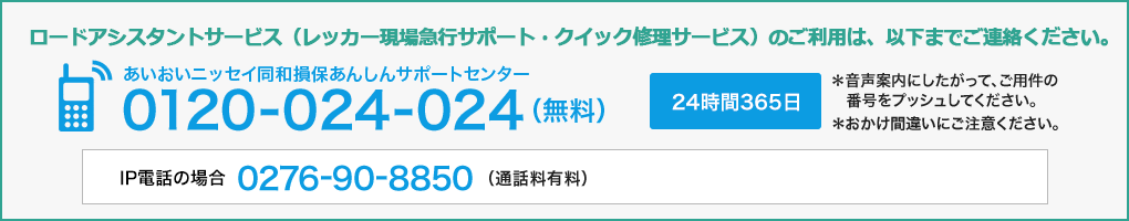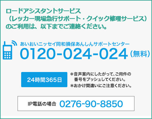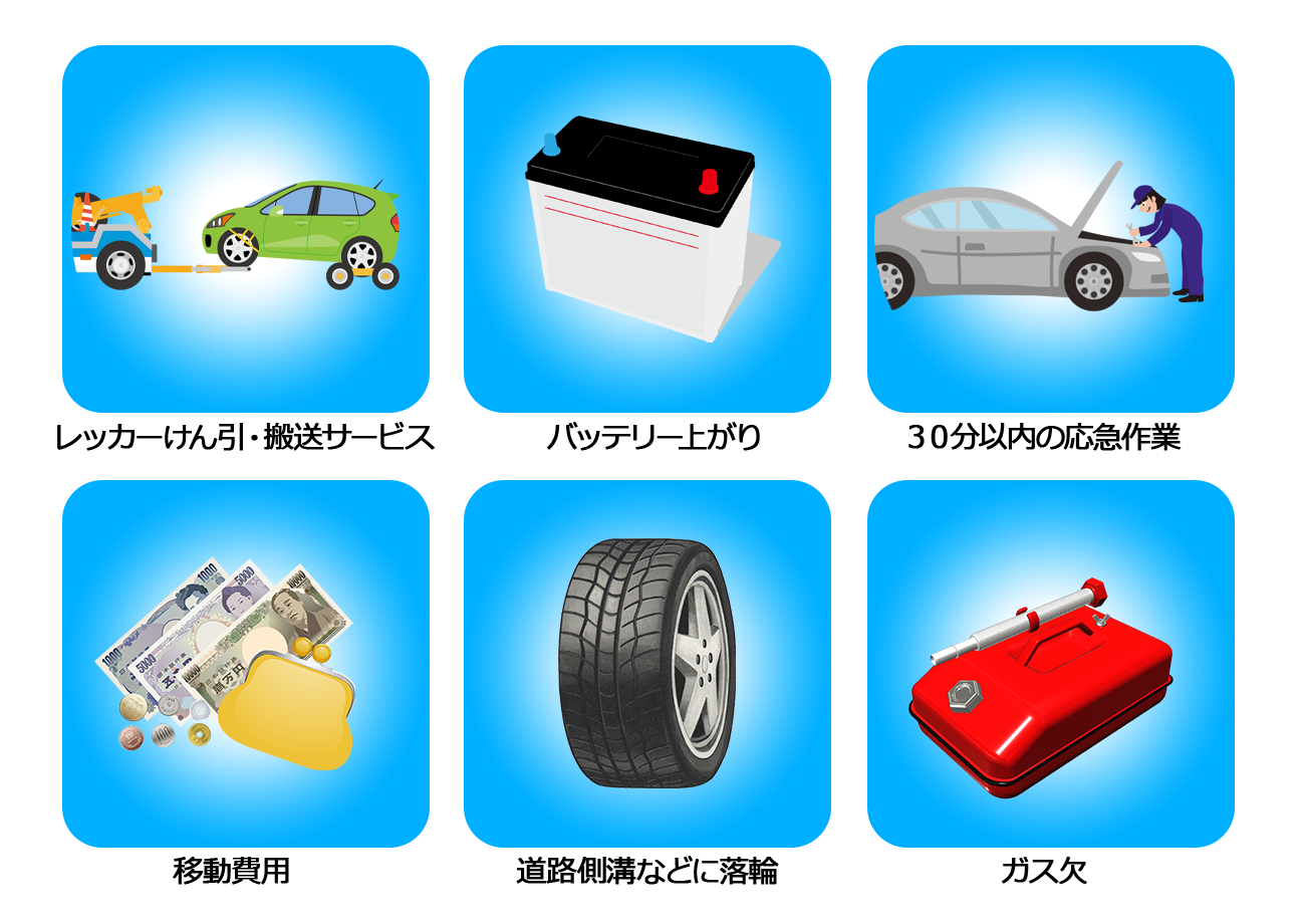 お車が事故または故障・トラブルにより自力走行不能になった場合に、24時間365日現場に駆けつけ、レッカーけん引・搬送等や.応急作業を行います(ロードアシスタンスサービス)。